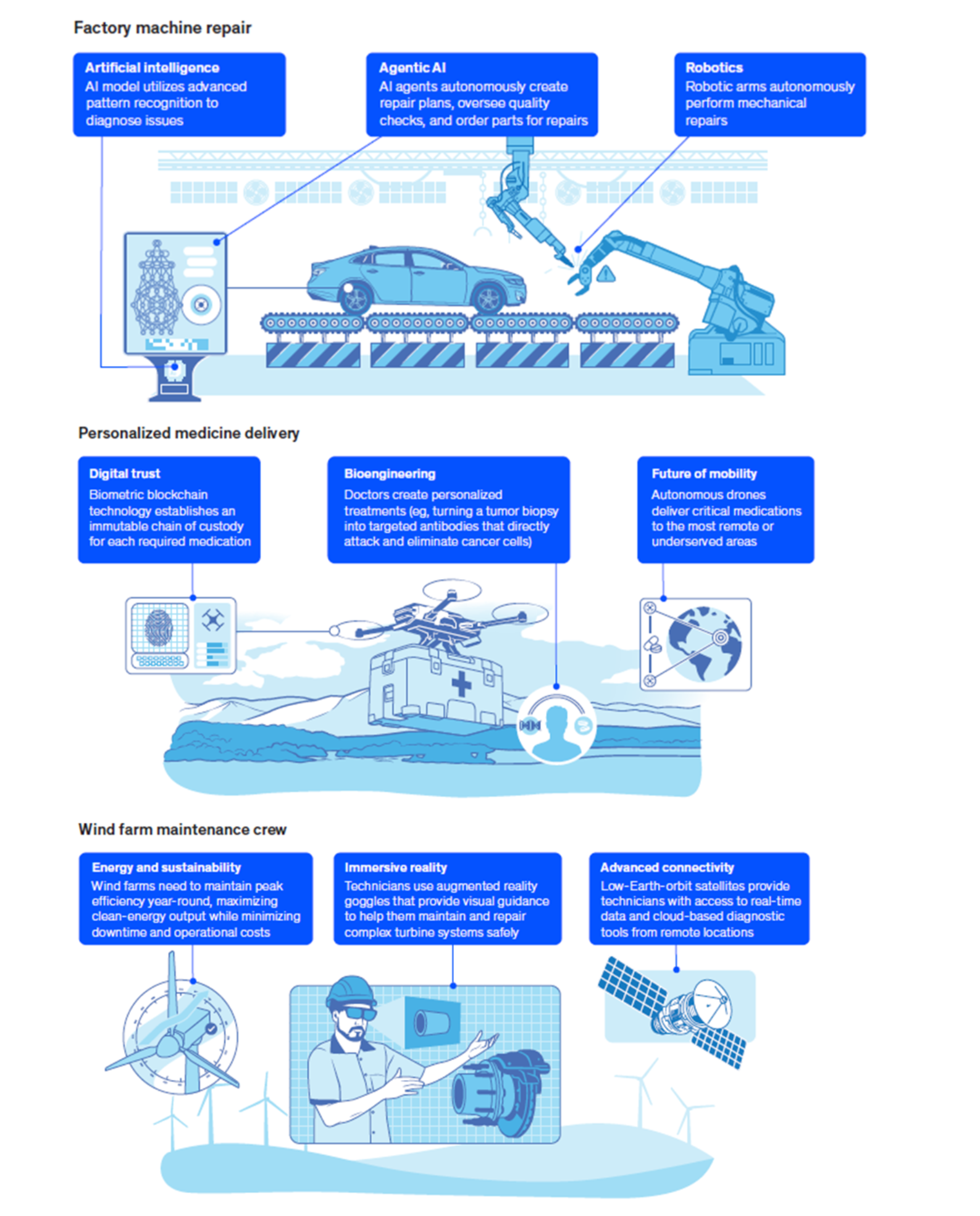 Na spodnjih fotografijah so navedeni trije različni primeri kako lahko različne tehnologije skupaj ustvarjajo celoten digitalno-industrijski sistem, ki je potreben za izpeljavo industrijskega ali drugega procesa. Primeri se nanašajo na izdelavo avtomobila, bolnišnične obravnave in dostave ter procese vezane na vzdrževanje.
