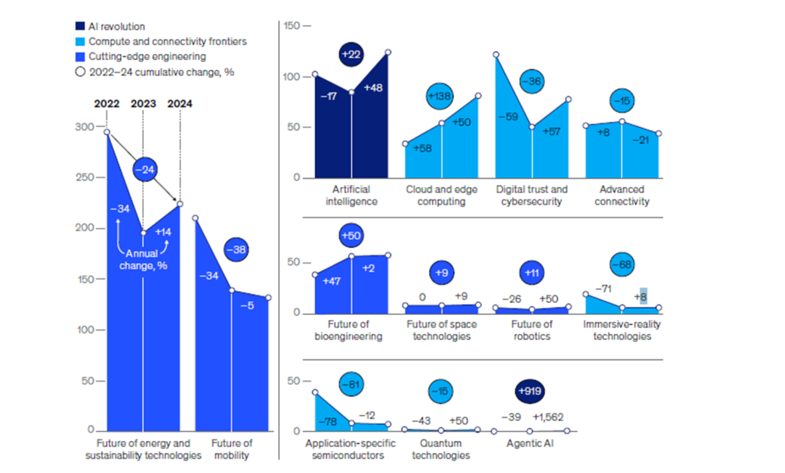 Trije Glavni tehnološki trendi leta 2025 glede na investicijske tokove in največjo rast od leta 2022 do 2024 so: Agentni AI in celotna umetna inteligenca, oblačno in robno računalništvo (Cloud in edge computing) kot razpršena izvajalne infrastrukture ter aplikacijsko specifičnih polprevodniki kot fizične osnove zmogljivosti sodobnih digitalno-industrijskih sistemov.